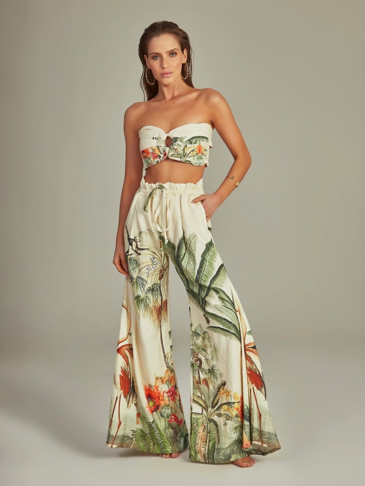 Para um look pós praia sofisticado, já em clima de verão, com os pés na areia e a brisa no rosto, use conjuntos frescos com estampas tropicais. O top cropped bustier é um modelo drapeado com argola central e duas amarrações nas costas. Faz conjunto com a calça pantalona de modelagem ampla que equilibra o look. Invista e use da praia à cidade!