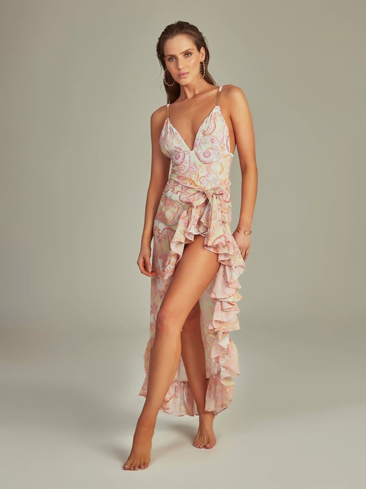 A Saia Ruffle Estampa Paisley Verde é estilo canga e amarra na lateral. Na barra tem um babado que deixa a peça com visual feminino e romântico. Tecido leve e fluído, com leve trasnparência.